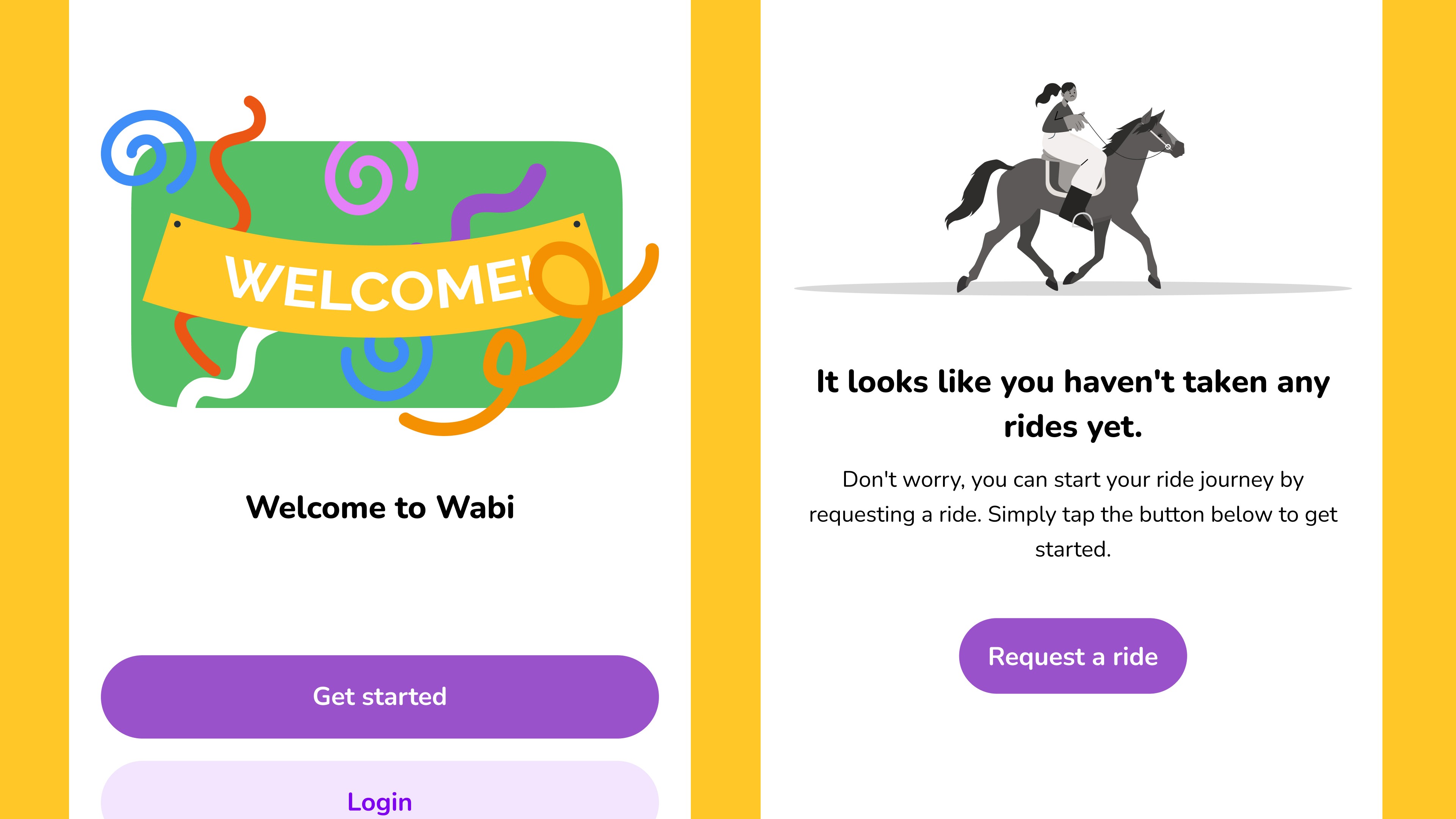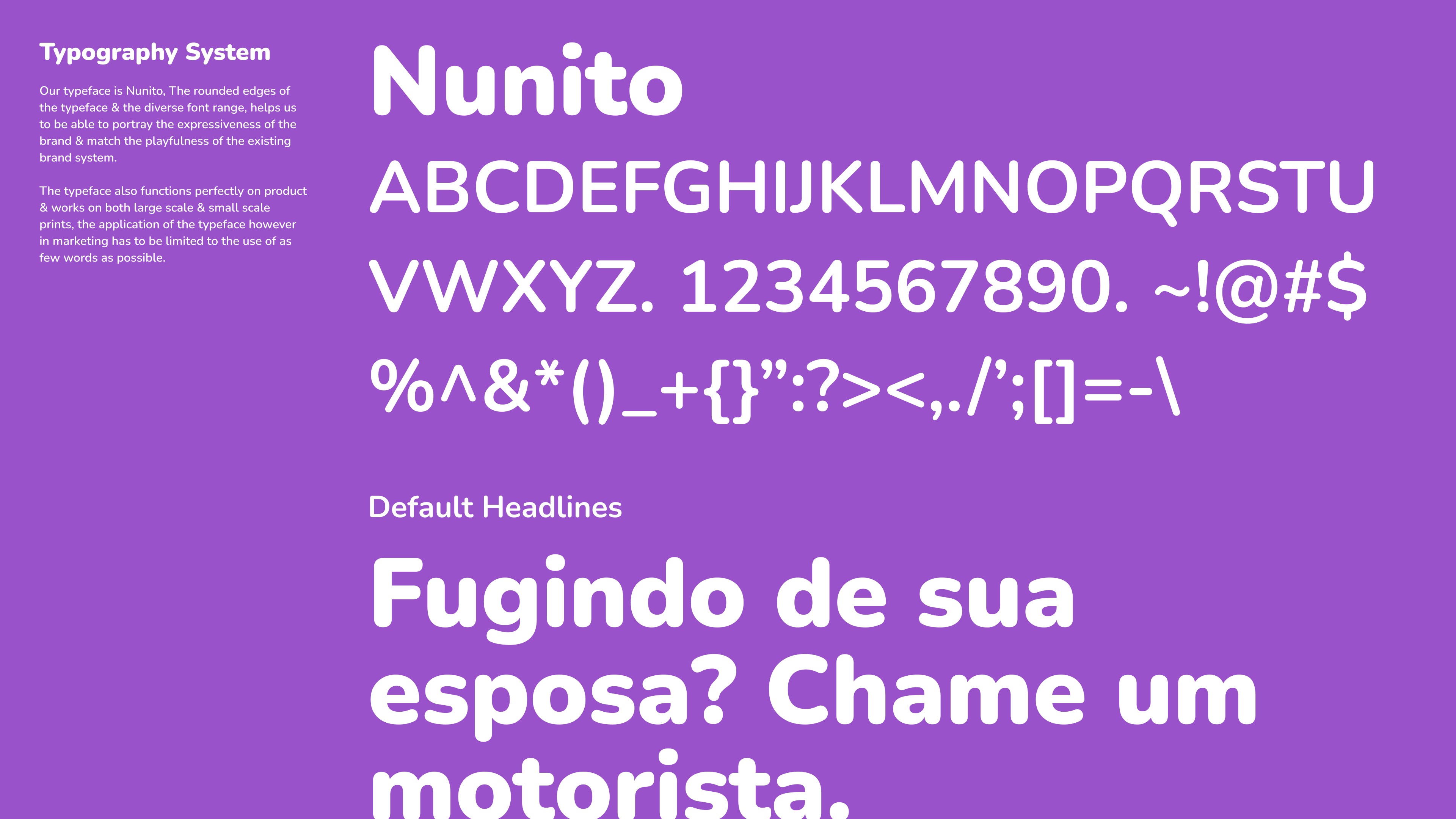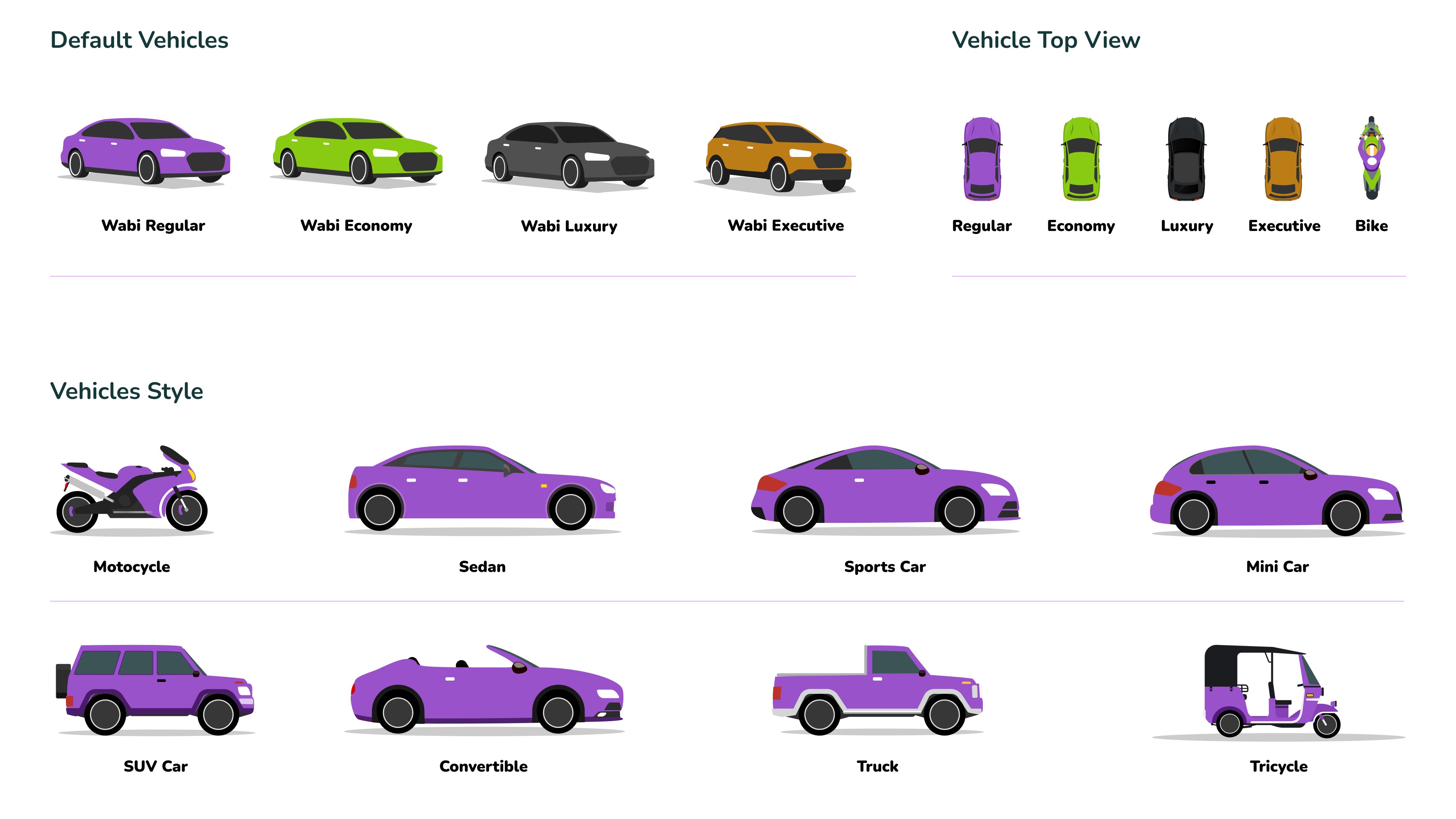 The design approach took a bold turn by embracing a purple-centric color palette, a deliberate choice to distinguish Wabi from the typical greens and yellows of the ride-sharing industry. This bold use of color, paired with soft secondary tones, gave the brand a friendly and inviting feel. The use of the rounded "Nunito" typeface added expressiveness and playfulness, aligning with Wabi’s open and interactive persona.